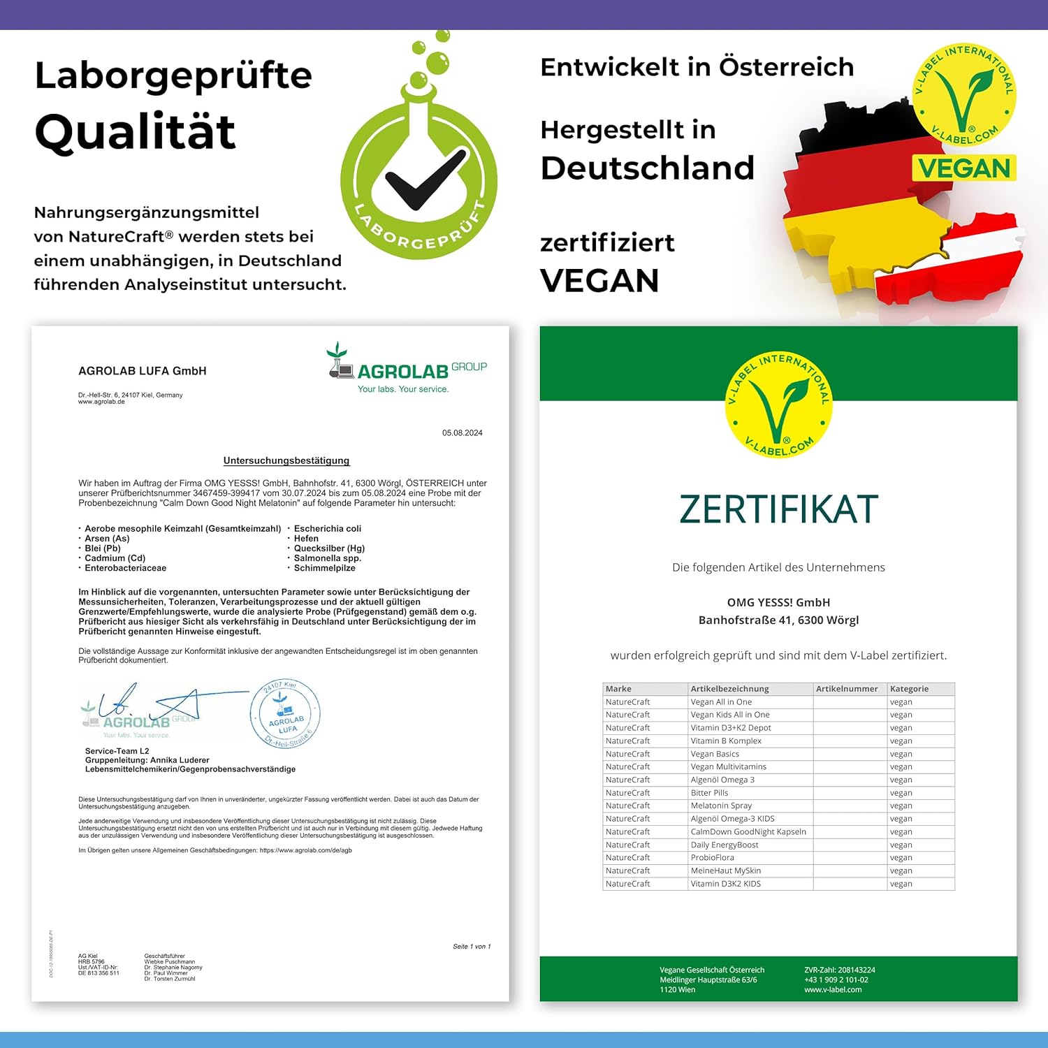• Die in ÖSTERREICH entwickelte Rezeptur wird nach strengen Qualitätsstandards nach HACCP-Standards in ÖSTERREICH produziert. Jede Charge wird von einem unabhängigen deutschen DIN EN ISO/IEC 17025 zertifizierten Labor fortlaufend geprüft.