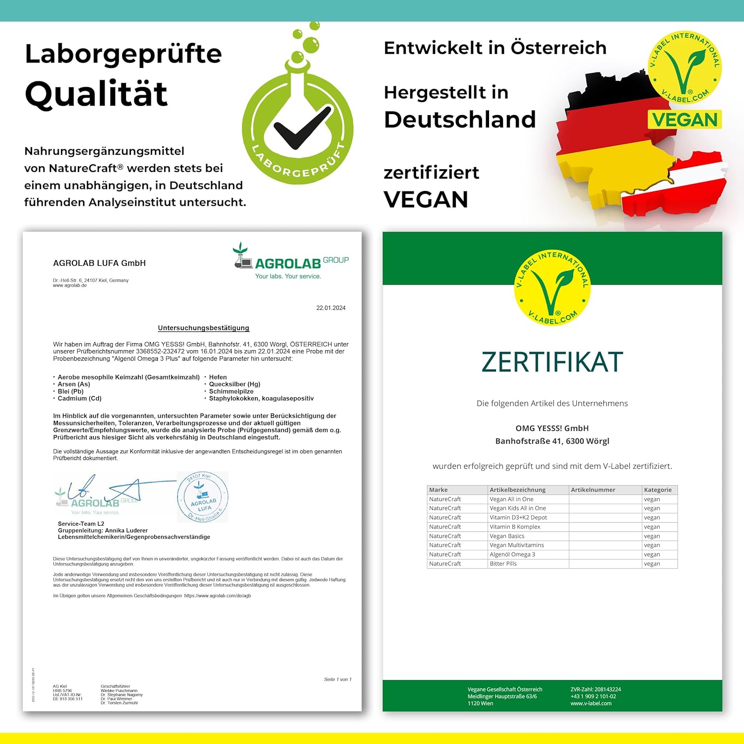 - Die in ÖSTERREICH entwickelte Rezeptur wird nach strengen Qualitätsstandards nach HACCP-Standards in DEUTSCHLAND produziert. Jede Charge wird von einem unabhängigen deutschen DIN EN ISO/IEC 17025 zertifizierten Labor fortlaufend geprüft.