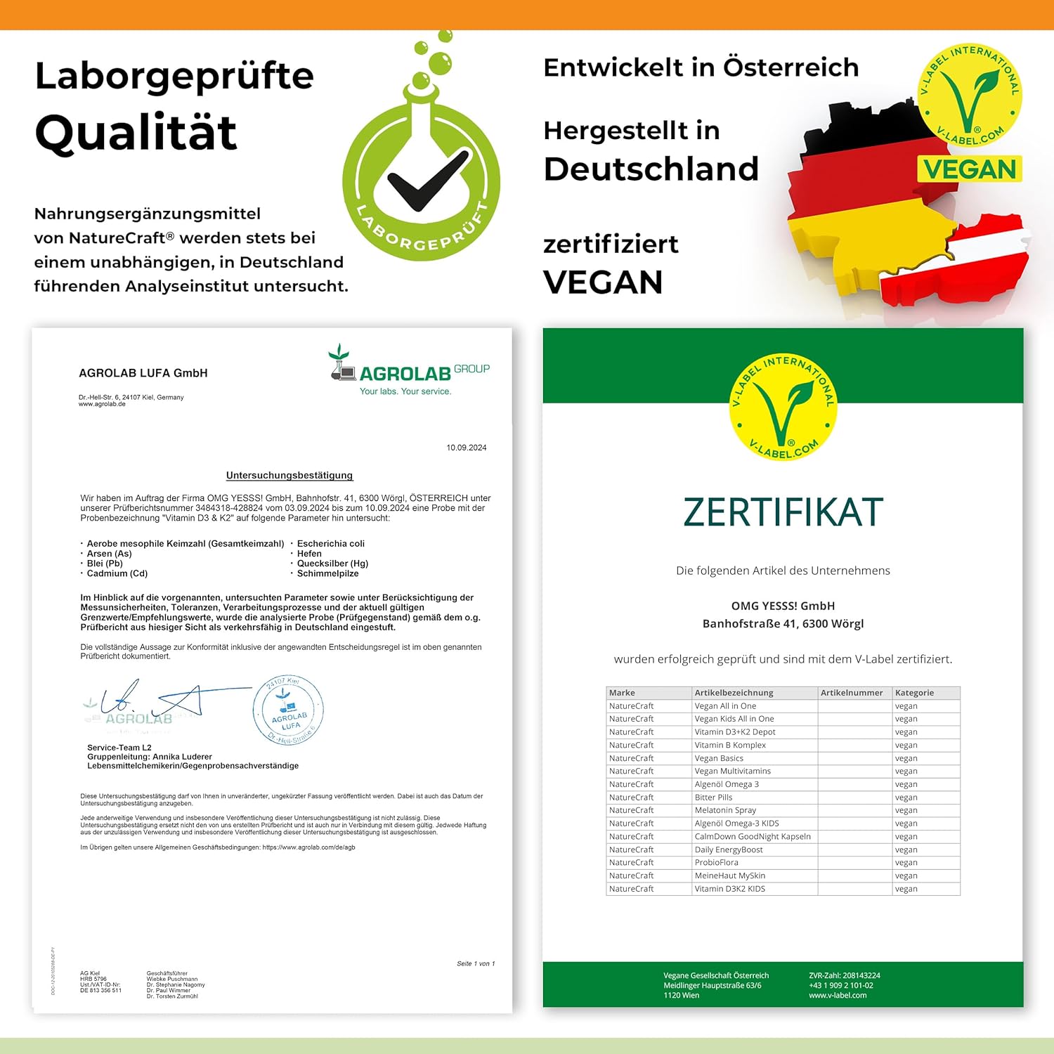 - VEGAN V-Label zertifiziert ohne Tierleid, Laktose- sowie glutenfrei, Gelatinefreie und natürlich ohne Gentechnik.